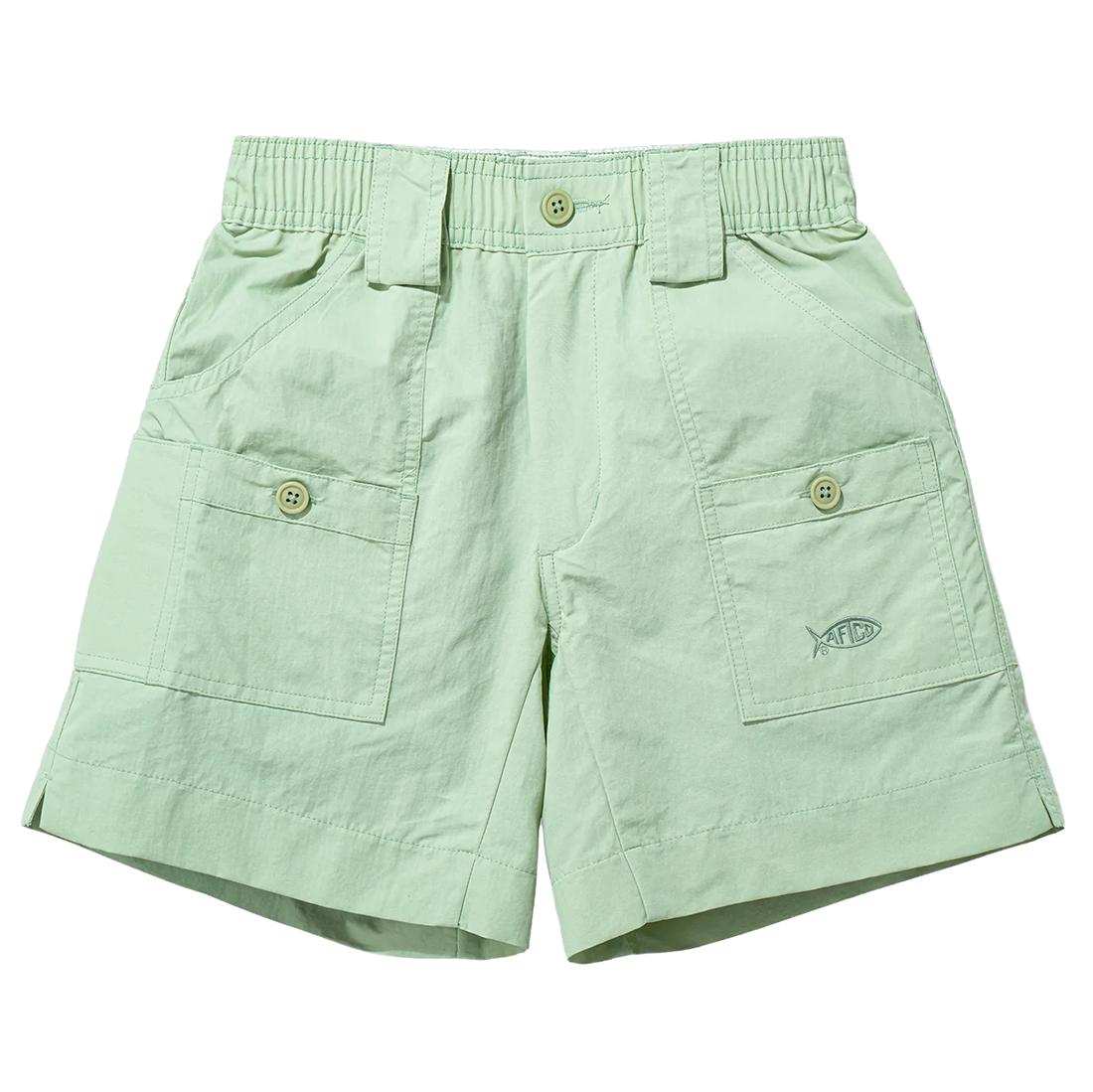 The "Original" AFTCO short, is now offered in Boys sizing! Introduced in 1989 the "Original" AFTCO fishing short has been the choice of serious fishermen nation-wide. These AFTCO shorts for boys are constructed of Dupont Supplex 3-ply nylon and has been treated with a stain resistant coating. It is a extremely strong and supple fabric that is also lightweight and super comfortable day in and day out. Included these shorts have 7 pockets (including a cordura-lined pliers pocket) so you will have a place for everything. It also has a double layered rear for extra strength. 27 bar tacks keep these fishing shorts strong in all the right places. AFTCO embroidery on the left pocket. Elastic waist + belt loops. AFTCO kids shorts are built to handle all they can throw at them.
