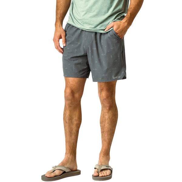 These high-performance fishing shorts can do it all, allowing anglers to move swiftly from sea to shore. They're made from breathable woven mesh spandex fabric with a 4-way stretch designed to move with you. The Swiftwater Shorts have ample storage options with front and back hand pockets and a side zipper pocket. These 7-inch inseam shorts are quick-drying, have a drawcord waist to adjust the fit, and are finished with a rubber AFTCO patch.