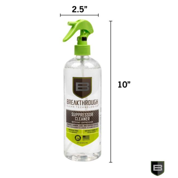 The Breakthrough Clean Technologies® Suppressor Cleaner is a water-based, ammonia-free cleaner that removes heavy carbon and lead deposits. Utilizing a proprietary blend of chemical surfactants and detergents, this cleaner effectively neutralizes all corrosive residues, preventing damaging rust and corrosion without etching or harming your suppressor.