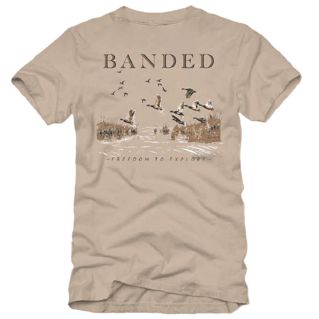 This Banded Mallards Flying Scene Short-Sleeve Tee is perfect for any outdoor enthusiast and features a striking waterfowl scene with flying Mallards. The tan short-sleeve tee offers comfortable everyday wear and is a great addition to your wardrobe.