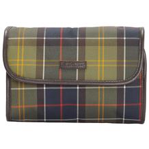 The Barbour tartan hanging washbag features a faux leather trim for a touch of sophistication. A concealed stud fastening under the front flap folds out to reveal multiple inner pockets for handy storage while you're on your travels. Boasting a hanging hook for functionality, the wash bag is finished with a discreet Barbour embossed badge to the front flap.