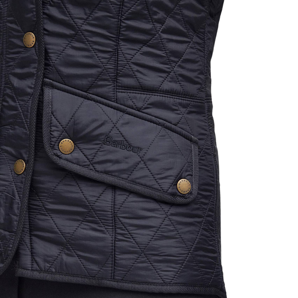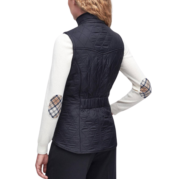 The Barbour Cavalry Gilet is a riding-inspired design constructed with a diamond-quilted outer and a contrast fleece lining for luxurious warmth. An elasticated rear waist and a curved hem create a feminine silhouette, while grosgrain trims and angled pocket flaps enhance the flattering appearance.