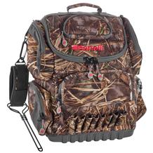 Ducker Backpack, Max-7. This Ducker backpack showcases the Realtree Max-7 camouflage pattern. An easy carrying pack that's constructed of 600D PVC backed fabric, making it very rugged and water resistant. This feature-rich bag includes: external shell holders, a hard-shell glasses pouch, custom zipper pulls, reinforced straps, and a padded, breathable back. The self-supporting EVA bottom design and easy-access zippered top make this pack ideal for any blind. Measures 17" x 7" x 12".