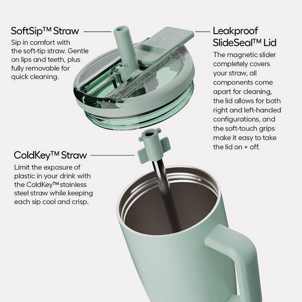 Era Flip 40oz is the world’s first 100% leakproof, covered, flip-down, straw tumbler. It has our fully leakproof SlideSeal™ lid that works for both cold and iced carbonated beverages, SoftSip™ silicone straw so every sip feels like a luxury, ColdKey™ metal straw for minimizing the amount of plastic sitting in your water, BevGuard™ technology to keep your drinks cold for 24+ hours, and a cup holder friendly base so you can enjoy your favorite beverages, free of leaks and spills throughout your daily journey. Made for stress-free sips.