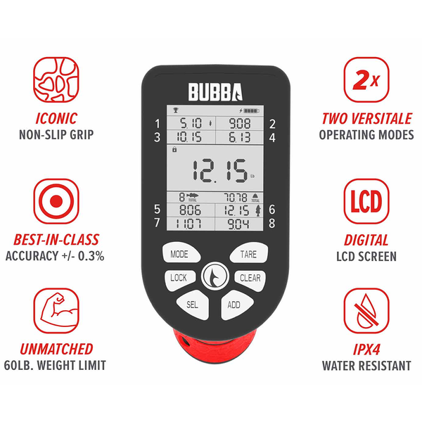 Introducing the newest top-of-the-line fishing tool from BUBBA, the Smart Fish Scale. Featuring our ICONIC NON-SLIP GRIP, the SFS is the perfect fish scale, whether you’re a hobbyist or a fierce competitor. The unmatched 60-POUND WEIGHT LIMIT and BEST-IN-CLASS ACCURACY OF ±0.3% offers a fully robust fish scale like never before. The Smart Fish Scale features two different modes: Tournament Mode and Rally Mode that each include their own features and capabilities, such as a SMART CULLING SYSTEM, auto data for total bag weight, and livewell management of up to 8 fish. With the waterproof product design, you can ensure this product will never fail you even on the toughest days on the water.