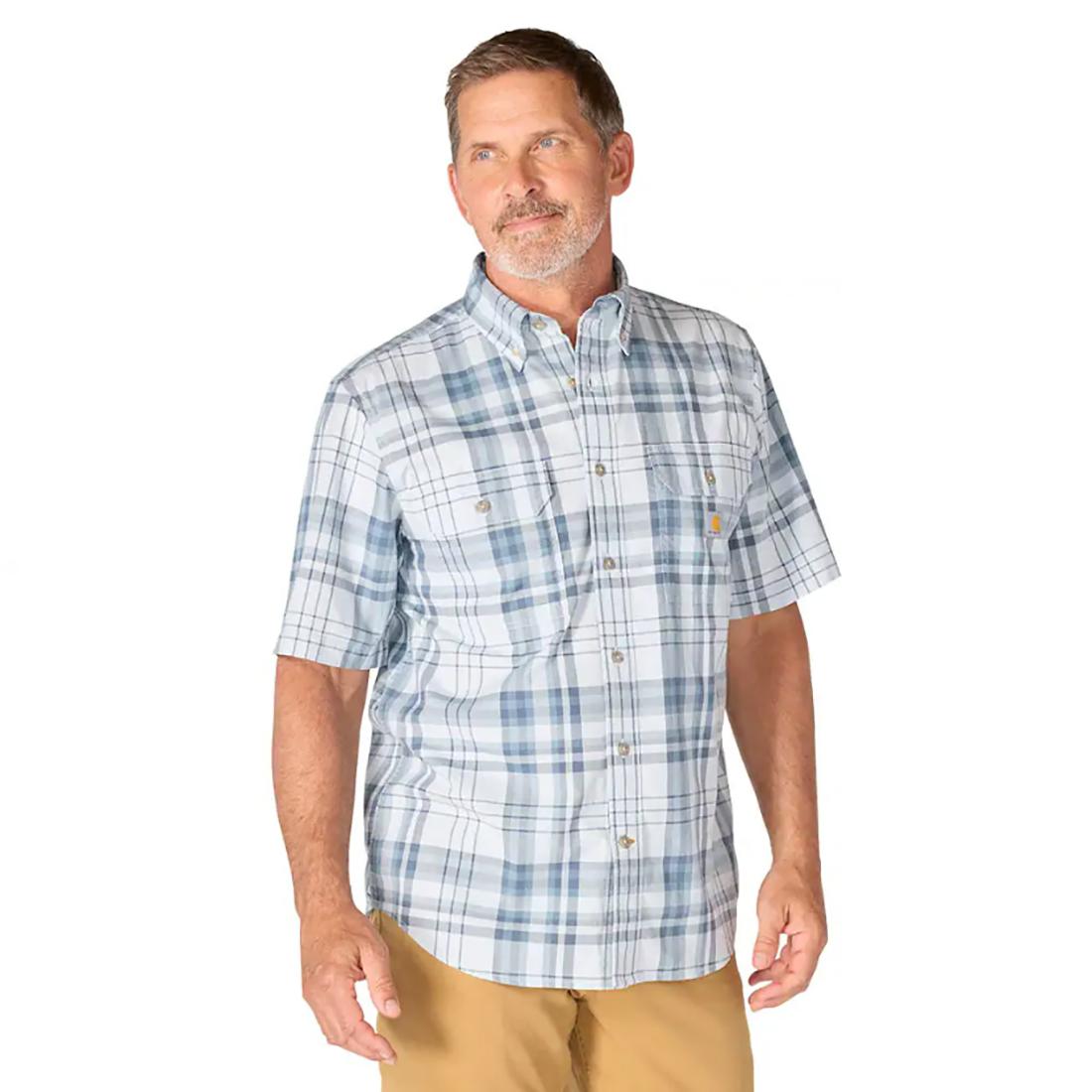 From workdays to weekends, this men's short-sleeve plaid shirt is a staple for any occasion. It's made from shrink-resistant fabric with a loose cut that gives you room to move. Two pockets on the chest have button closures for secure storage.
