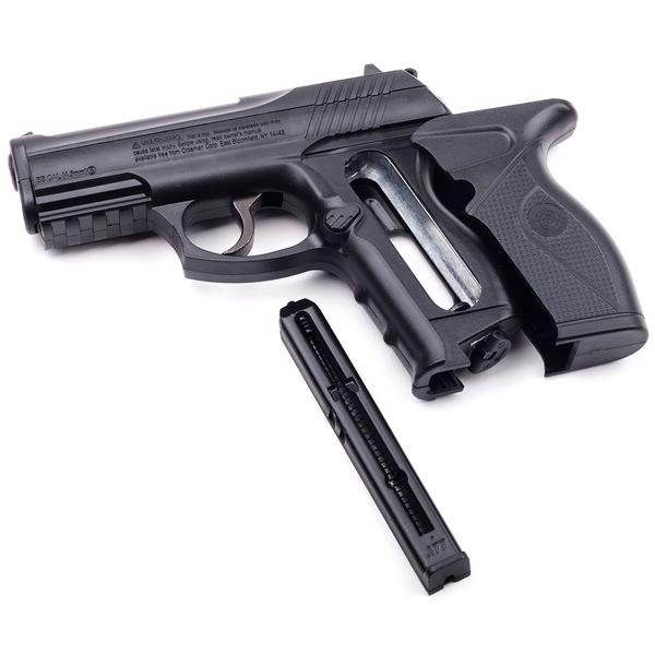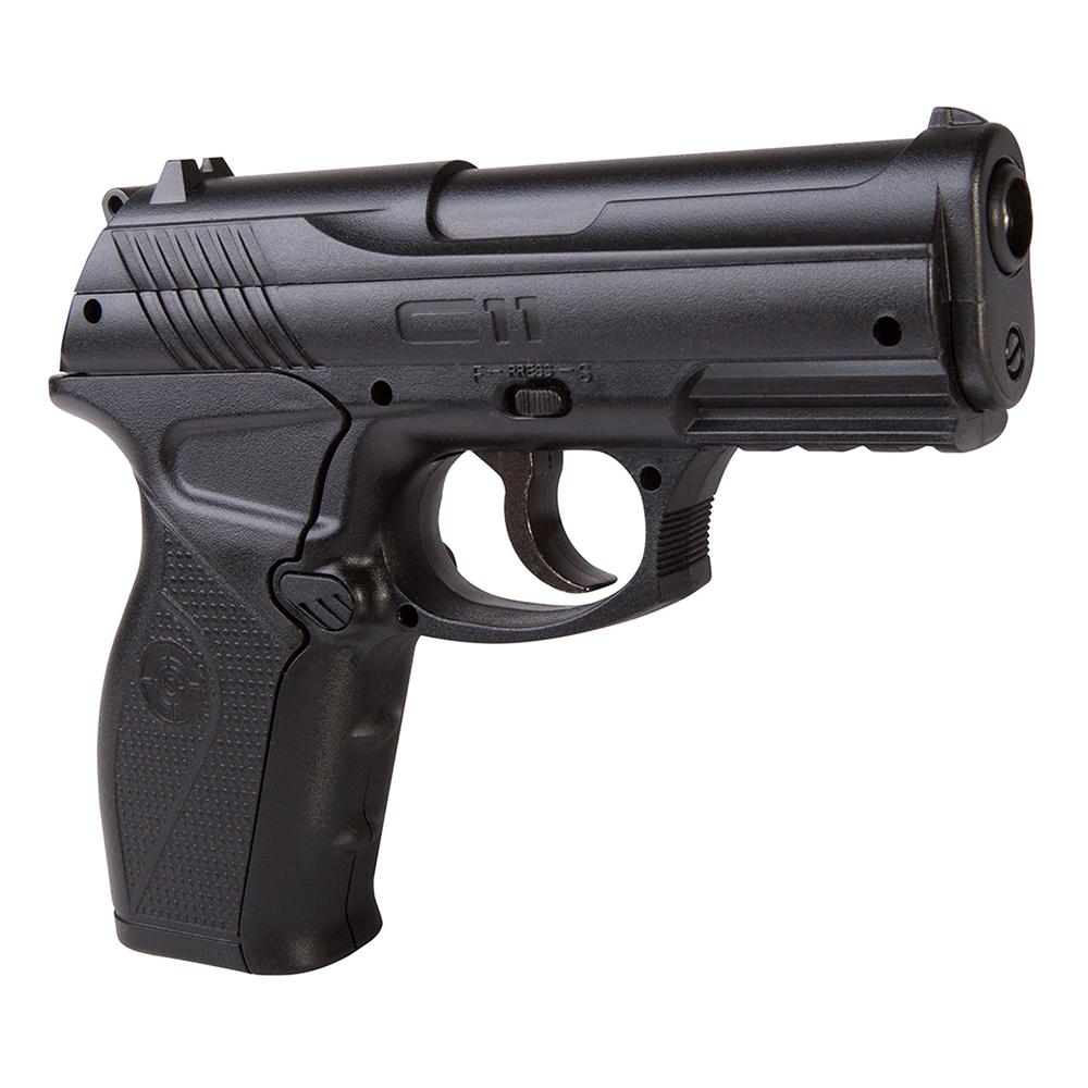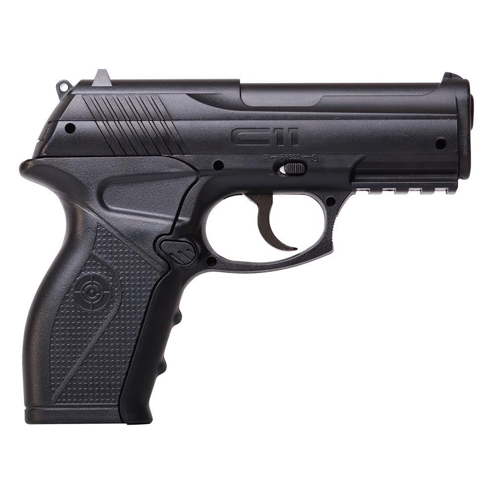 4.5 mm CO2 Powered, BB pistol - This semi-automatic CO2 powered pistol combines hand-held comfort with quality components, at an affordable price. It features a velocity of up to 480 feet per second and an accessory rail under the barrel. The C11 also features a removable magazine for BBs, as well as grips that slide back for easy replacement of CO2 Powerlets.