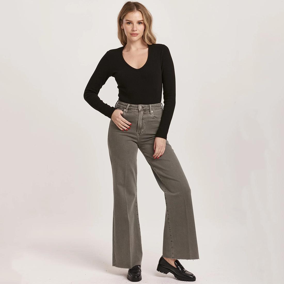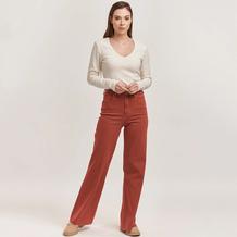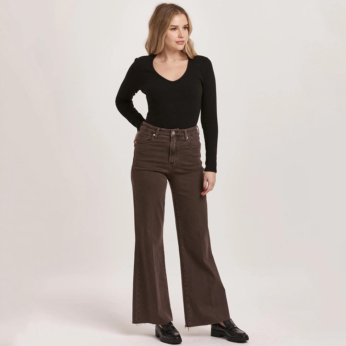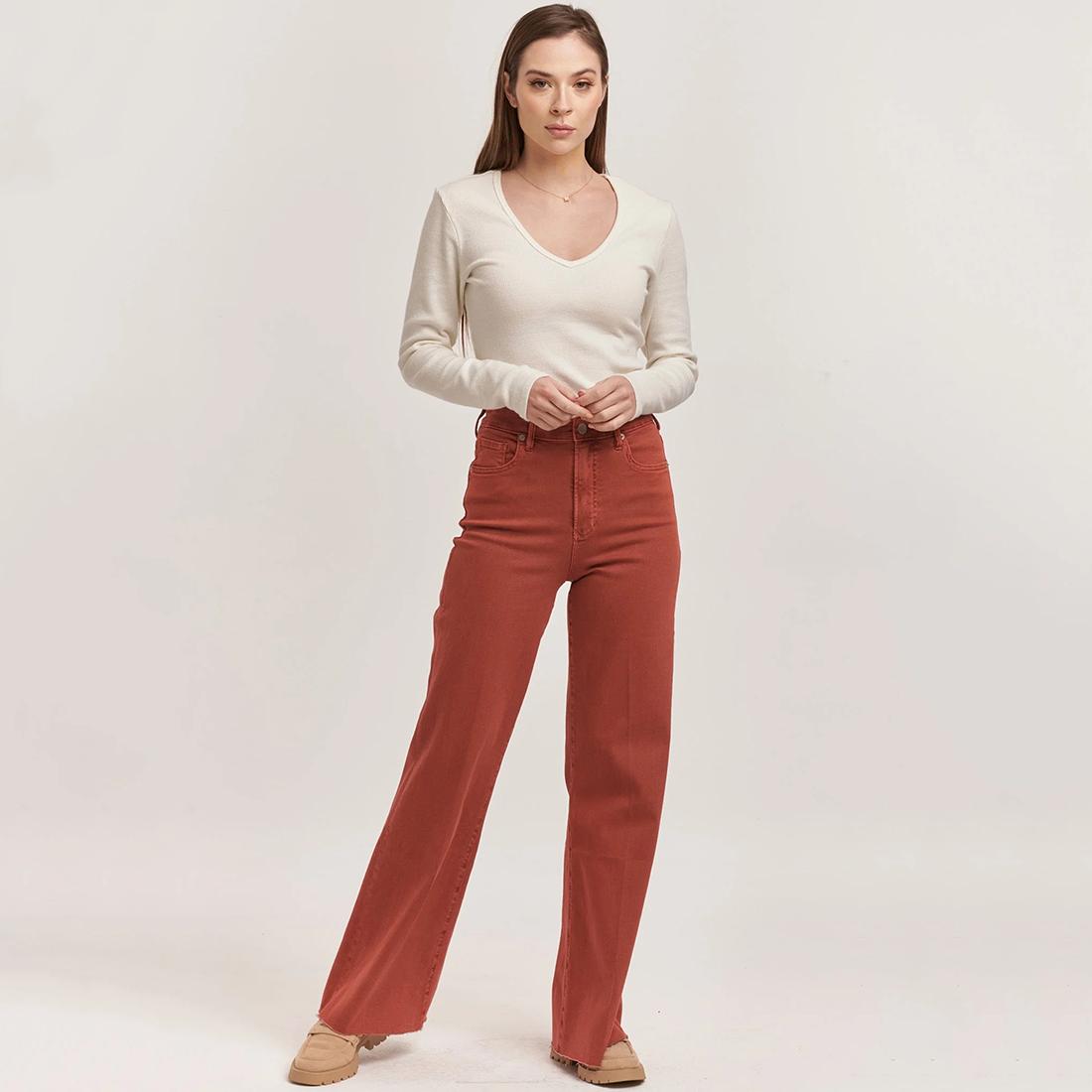 High rise wide leg jeans. It's cozy fit that sits at natural waist, embraces your natural curves and accentuates your hips and thigh. Full inseam on stretch denim featuring cut-off hem details add flair to these soft pants, available in designer colors, and finished with a center inseam press for a tailored look.