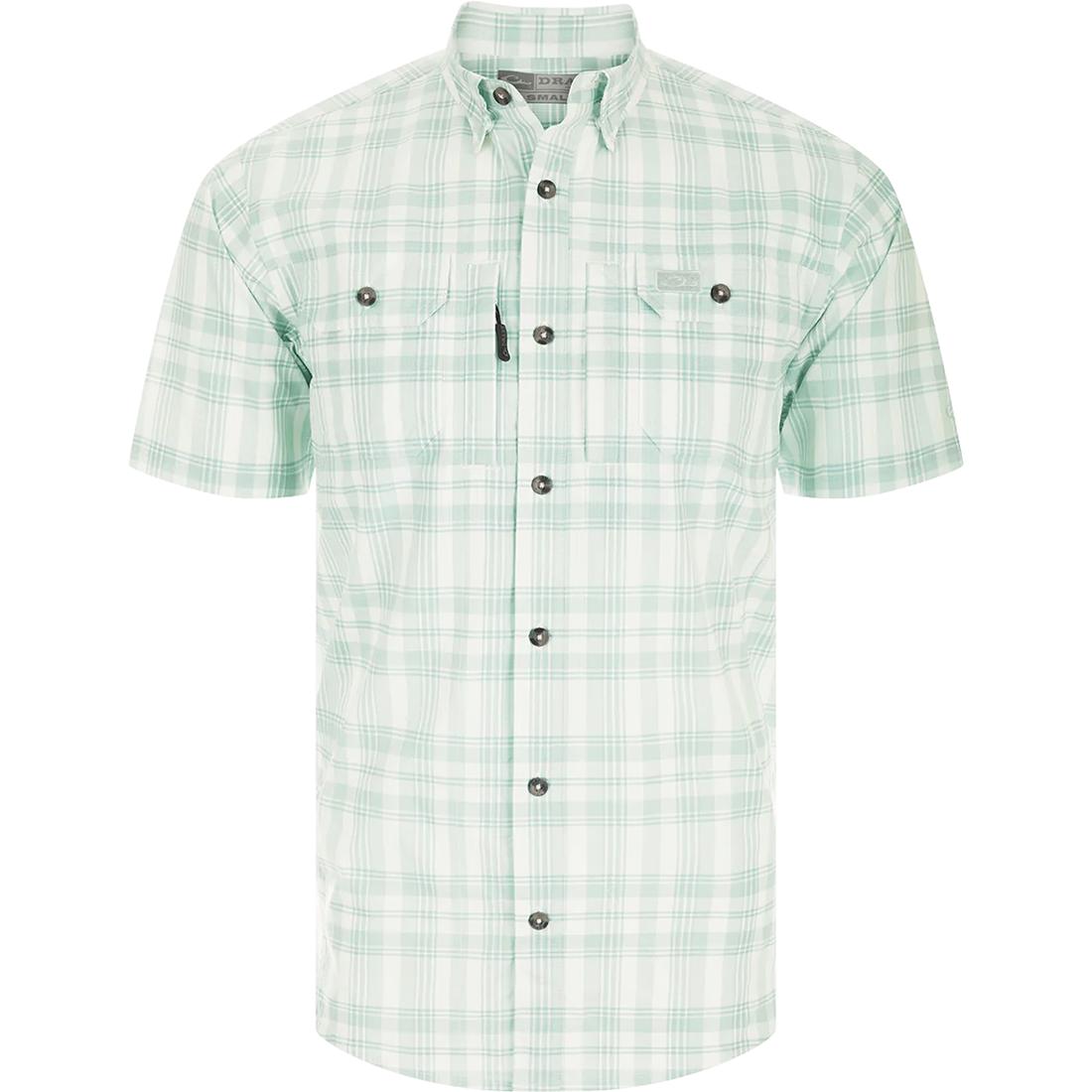 Look great in this lightweight Frat Faded Plaid Button-Down Short Sleeve Shirt made from 95% Polyester/5% Spandex. This shirt offers UPF 30 sun protection, moisture wicking, quick drying, and built-in stretch for comfort and mobility. It also features a hidden button down collar, vented cape back, two button-through flap chest pockets, a sculpted hem, and a sunglass wipe. Perfect for your active lifestyle.