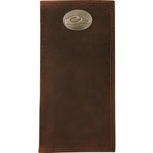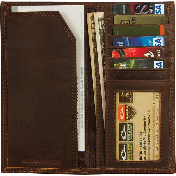 Brown Leather checkbook wallet with the Drake Logo metal oval on the outside.