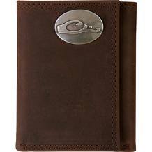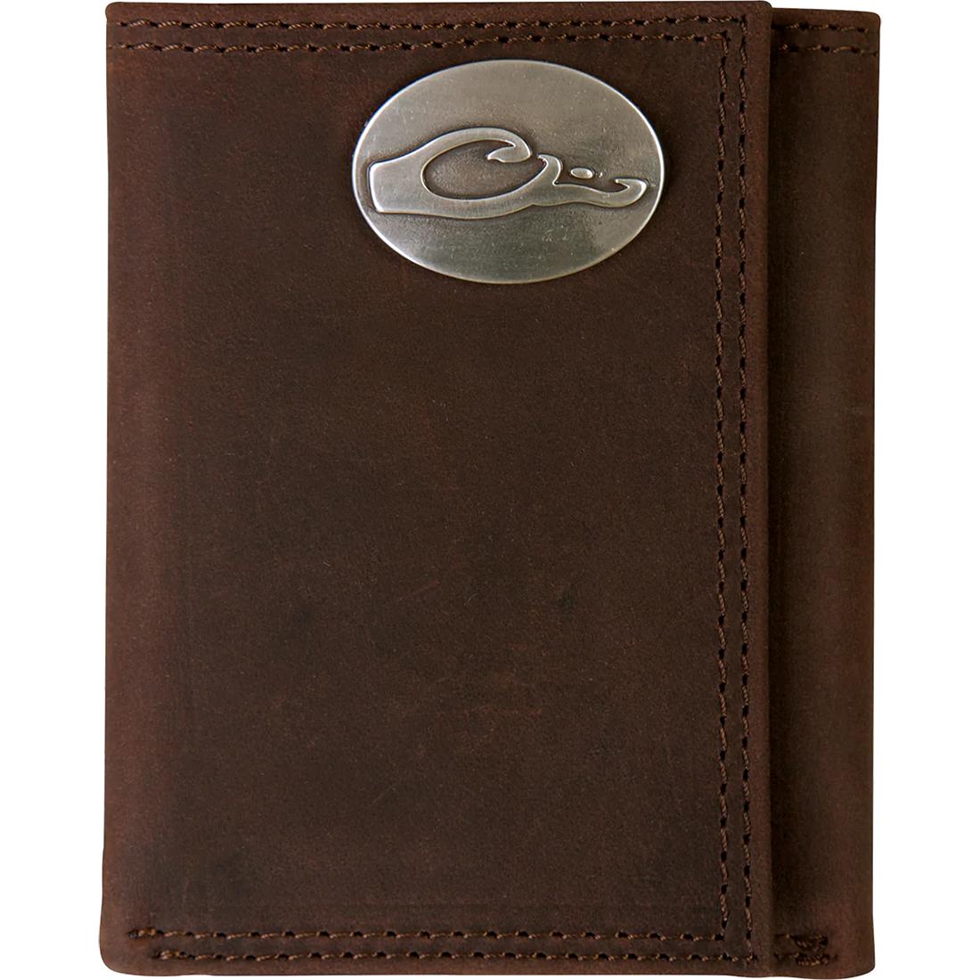 Brown Leather Tri-Fold wallet with the Drake Logo metal oval on the outside.