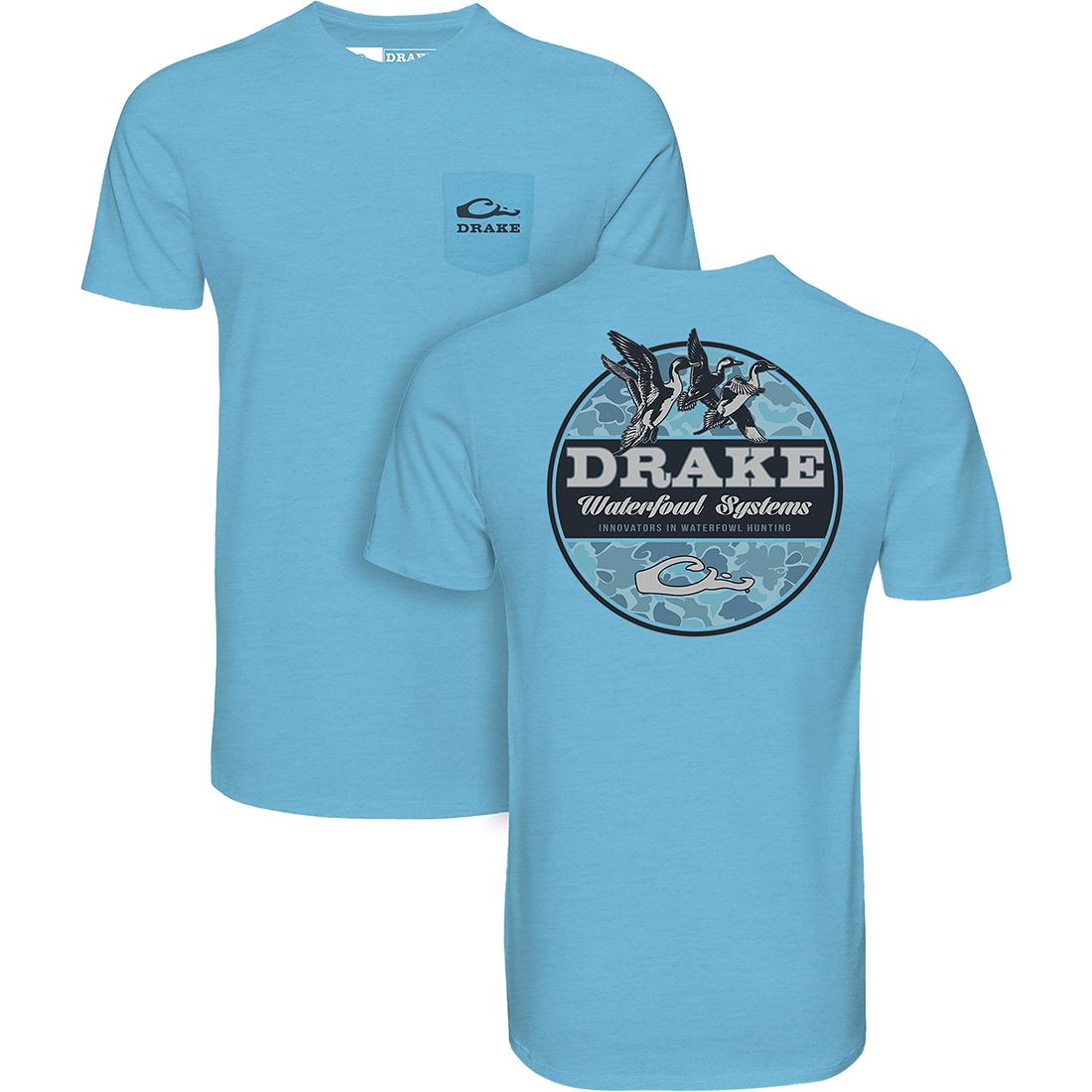 The Drake Waterfowl Graphic Tee is constructed with a fabric blend which supplies softness and comfort. The Drake Waterfowl Graphic Tee has a Drake logo on the front pocket and depicts ducks in flight from the Old School Camo Series of back graphic tees.