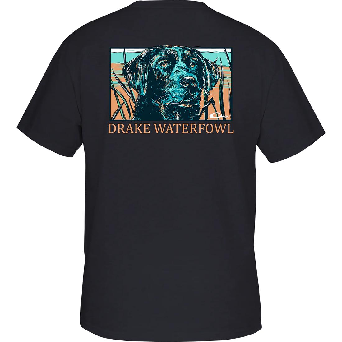 The Drake Waterfowl Graphic Tee is constructed with a 60% cotton and 40% polyester blend which provides softness and comfort. The Drake Waterfowl Graphic Tee has a Drake logo on the front pocket and depicts an abstract Black Lab from the Pop Art Series of back graphic tees.