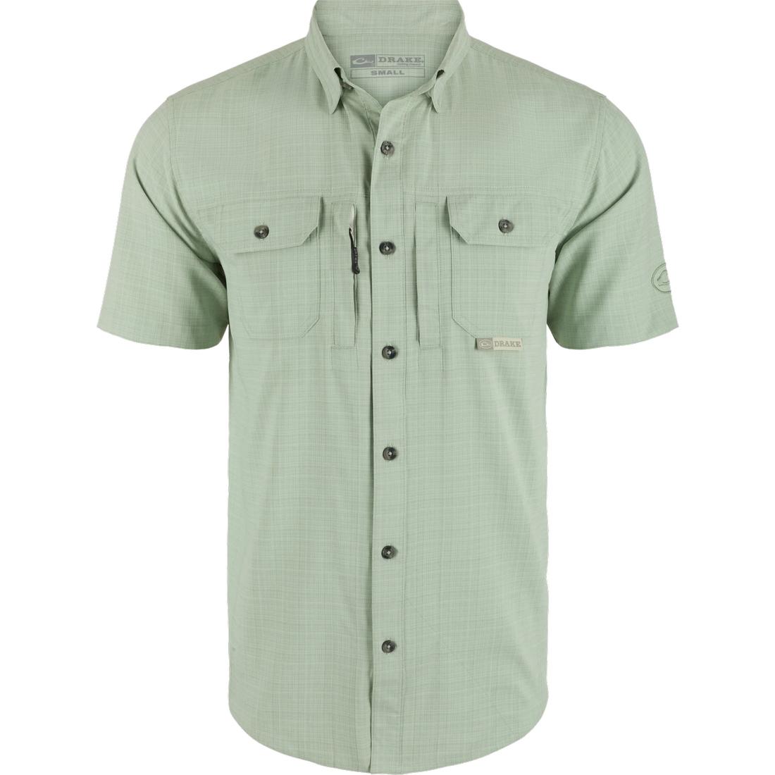 The Drake Wingshooter Trey Cross Hatch has a classic fit, a hidden button-down collar, two button-through flap chest pockets, and a vented cape back along with a laser-punched vented back. The pocket system includes a hidden zippered pocket on the right and a Magnattach closure behind the left pocket. It has a sculpted hem which allows you to wear tucked or untucked. Inside the hem is a built-in sunglass wipe.