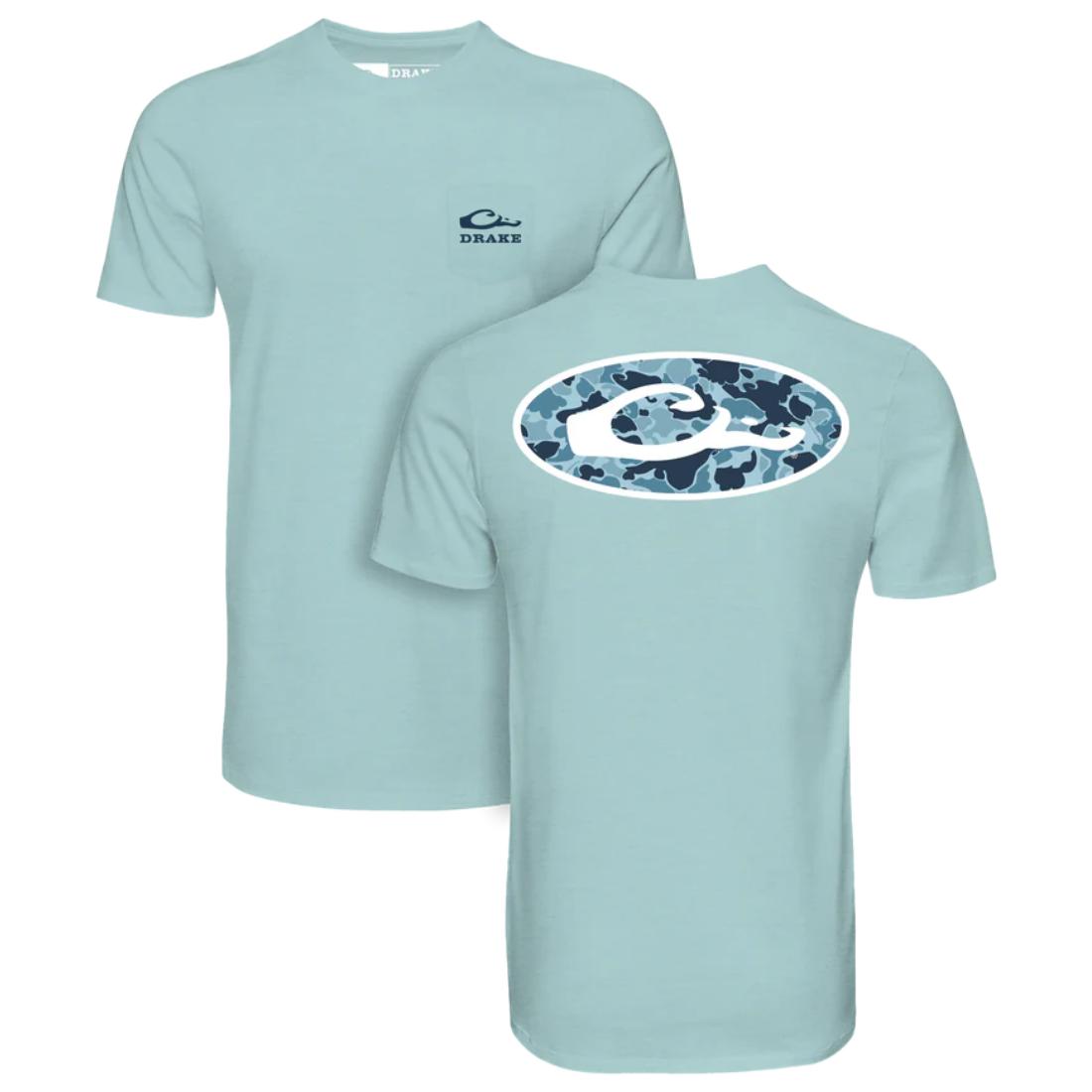 The Old School Oval T-Shirt is constructed with a 60% Cotton and 40% polyester blend which provides softness and comfort. The tee features a back screen print of Drake's exclusive Old School Camo with the Drake logo overprint from our Old School Series. The front left chest pocket features the classic Drake Waterfowl logo.