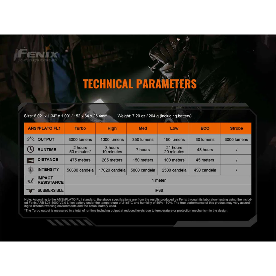 - Turbo: 3000 Lumens, 2.8 hrs, 1558 ft