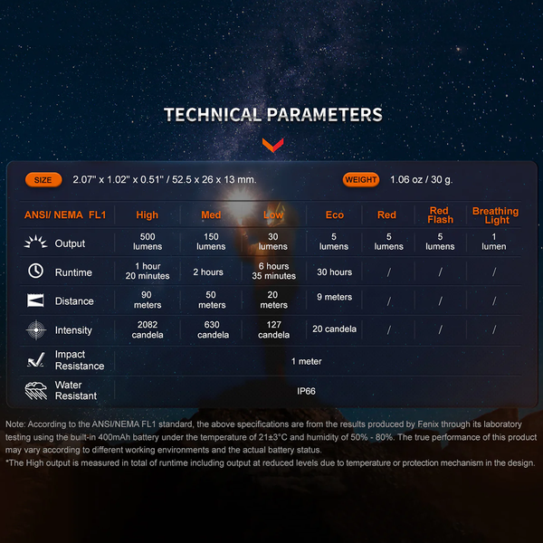 - Low: 30 Lumens, 6.6 hours, 65 ft