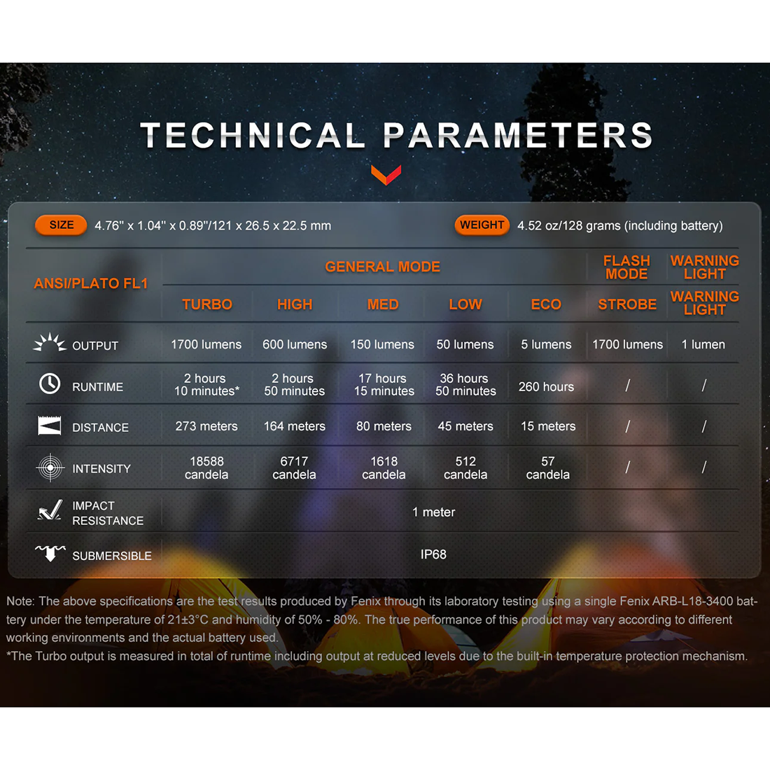 - Turbo: 1700 Lumens, 2.17 hours, 896 feet, 18,588 candela