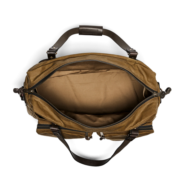 With a 34-liter capacity, the 48 Hour Duffle Bag is ideally sized for a long weekend. It is made from waxed Tin Cloth, the iconic canvas that's withstood the elements in rain-soaked backlands for a century. The main compartment is fully lined with unwaxed cotton to protect clothing and gear. The Bridle Leather handles are thick and strong for lasting service. Exterior zippered pockets keep quick-access essentials close at hand. The trolley strap on the back slides over the handles of rolling luggage for ease in navigating airport security. This bag meets airline carry-on size requirements, but if you do check it, the shoulder strap detaches to avoid snagging.
