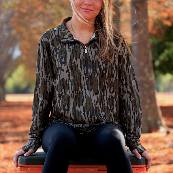 The Strait Place 1/2 Zip Performance Pullover is a lightweight, breathable women's camo pullover designed for warm weather hunting and everyday wear. Available in Mossy Oak® Original Bottomland® and Mossy Oak® Greenleaf®, this women's half-zip pullover features 4-way stretch fabric that flexes with your body, keeping you comfortable whether you're in the field or hitting the town. A flattering relaxed feminine silhouette features a longer drop hem with 2½" of extra coverage, plus thumb holes and side slits that give you the freedom to move. The back yoke showcases a bold gold GC stacked logo, while the signature gold zipper and olive tape trim add playful flair. Topped with a distinctive half-moon back neck detail and taller collar for that extra touch of style. With so much detail, it's Strait up awesome!