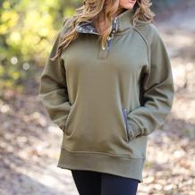 The Wilkes Creek Quarter Snap Pullover is an oversized women's pullover featuring subtle pops of Mossy Oak® Original Bottomland® camo. Blending everyday comfort with elevated detail, this timeless silhouette is finished with jersey Mossy Oak camo lining at the collar, snap placket, and welt pocket trim.