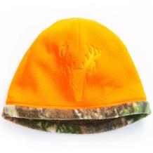 The fleece beanie with debossed "Hot Shot Deer" logo is reversible to ultrasoft camo fleece with roll-over trim and tonal flatlock stitching.