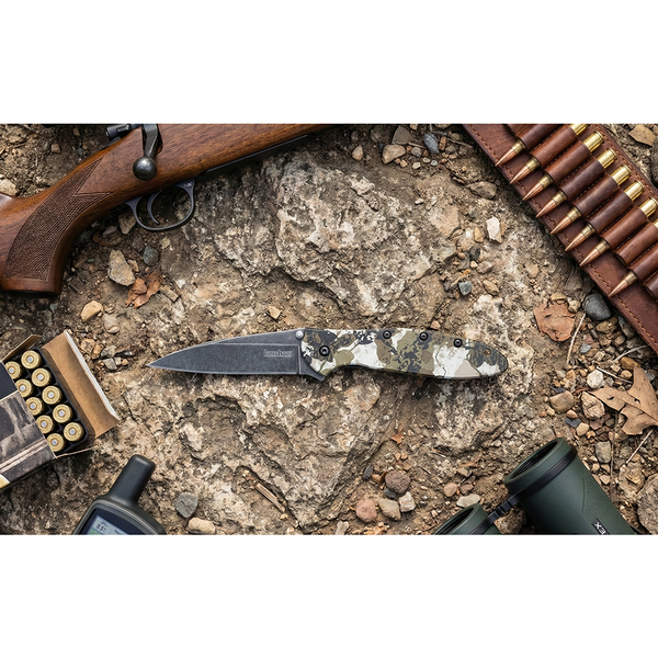 - Slim and sharp everyday field knife; Made in USA collaboration between Kershaw and King’s Camo™