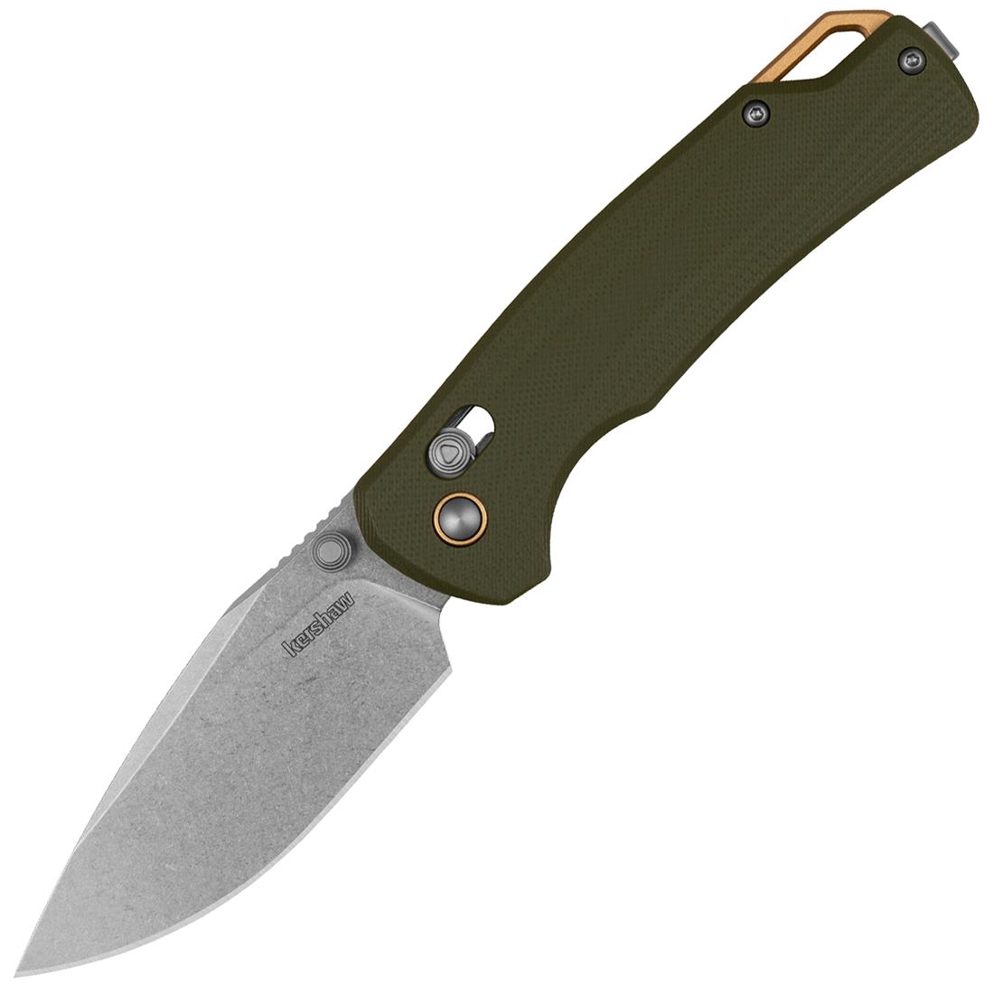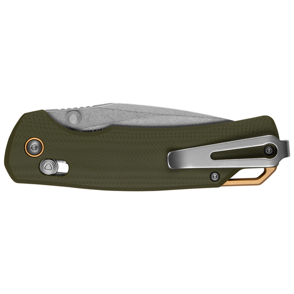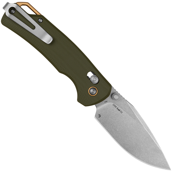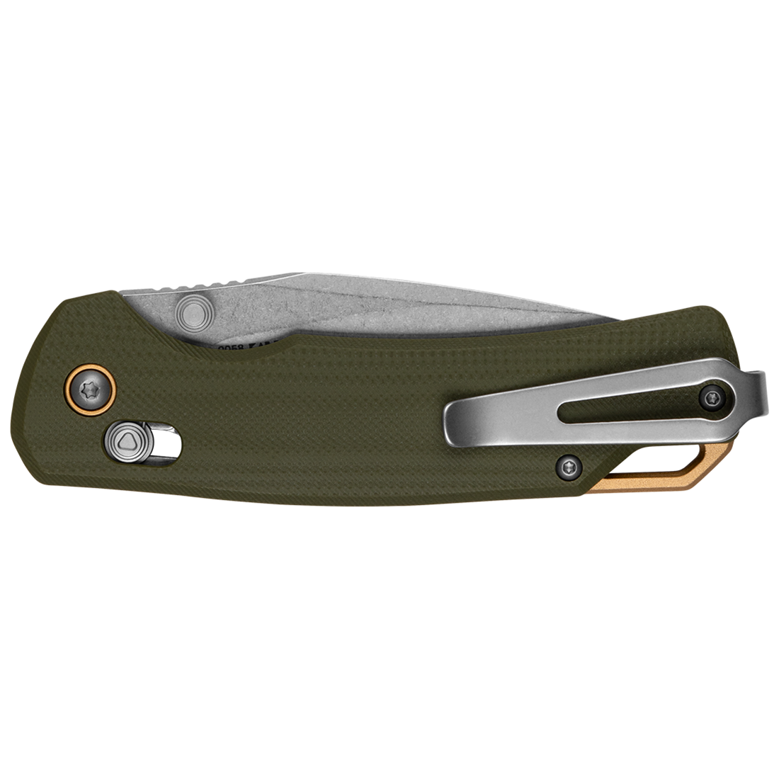 - Contoured olive G10 handle with gold-anodized aluminum trim rings and backspacer for an enhanced look and feel