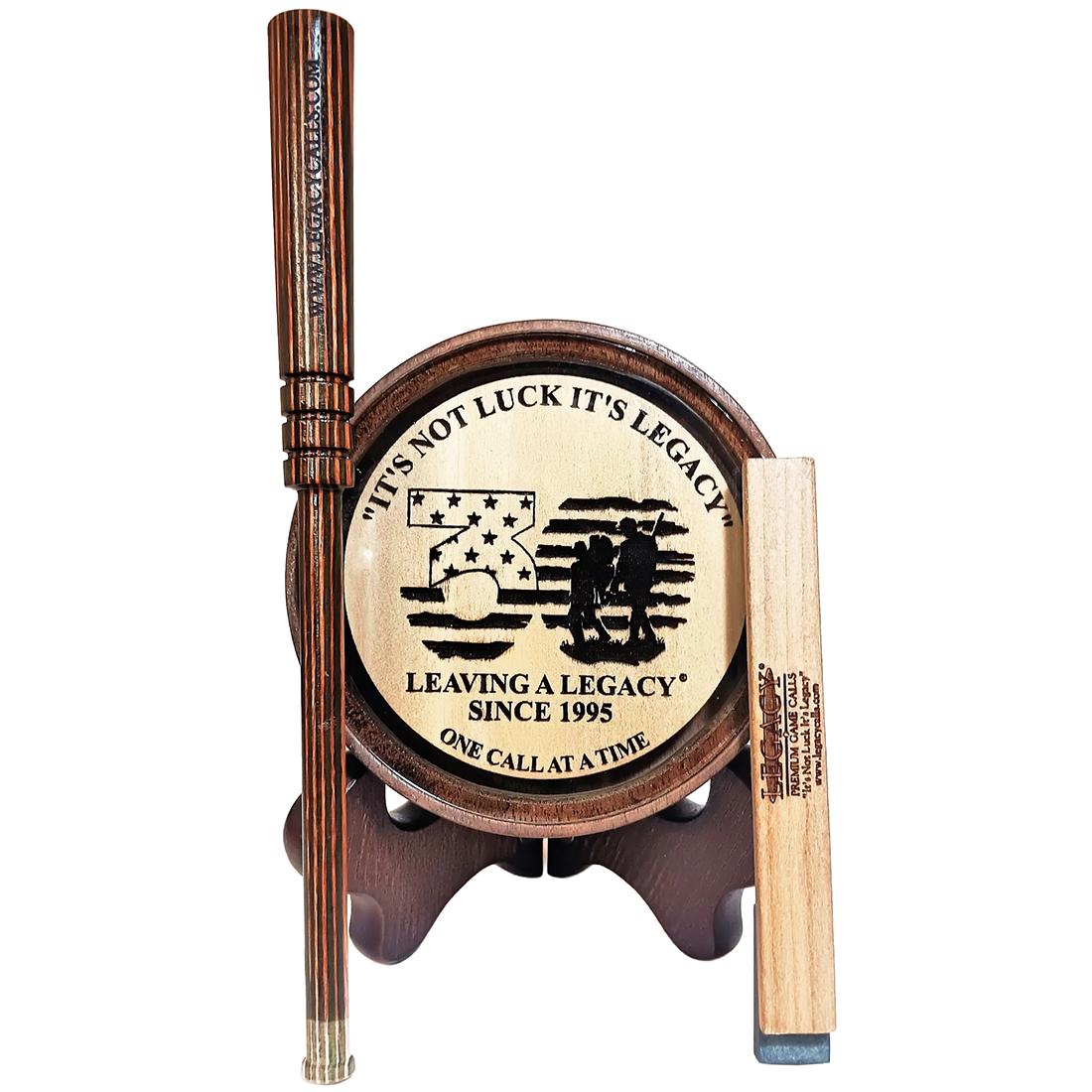Legacy Premium Game Calls Milestone Glass has a poplar sound board and a redesigned walnut pot. This call is a signification of their 30th Anniversary. This call embodies the spirit of American Legacy and Excellence. It comes with a one piece stabilized laminated striker and a sanding stone.