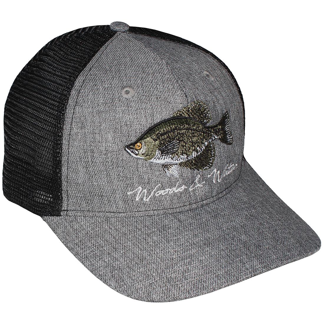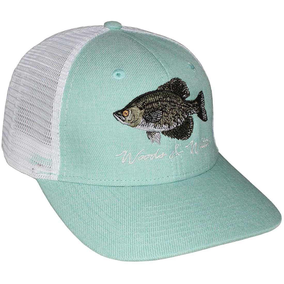 Mesh back hat with embroidered Crappie and Woods & Water script on front.