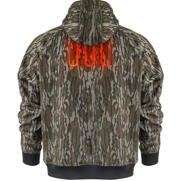 The Mobile Warming Mossy Oak BLX Heated Hoodie is a classic pullover with it's low-noise Polyester outershell and DWR water resistant finish adds an extra layer of protection while keeping you concealed and comfortabel all day long. Classic contour hood with durable adjustable pull strings and front hand pockets make this hoodie the perfect solution whether your in the field or on the job. The Mobile Warming multi-zone heat system is powered by a 7.4volt rechargeable lithium-ion battery, delivering up to 10 hours of heat to 2 heat panels in the front and 1 in the back. Adjust between 4 temperature settings to customize your heat level and extend time between charges.