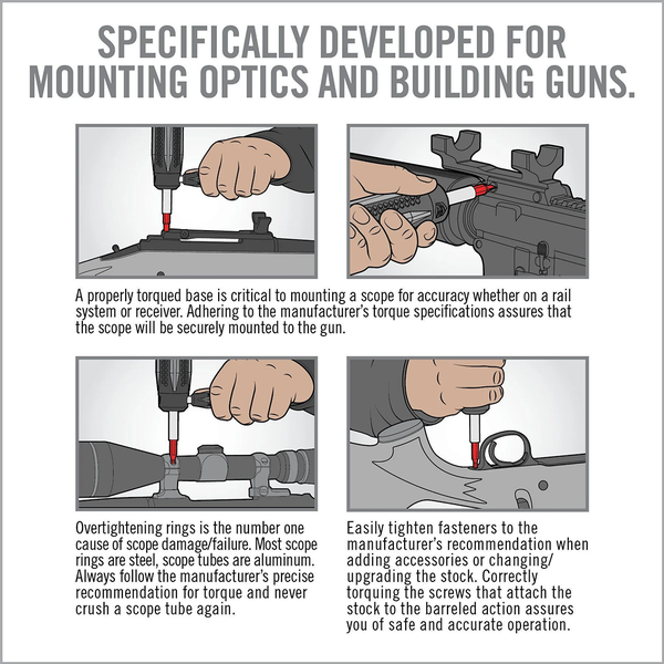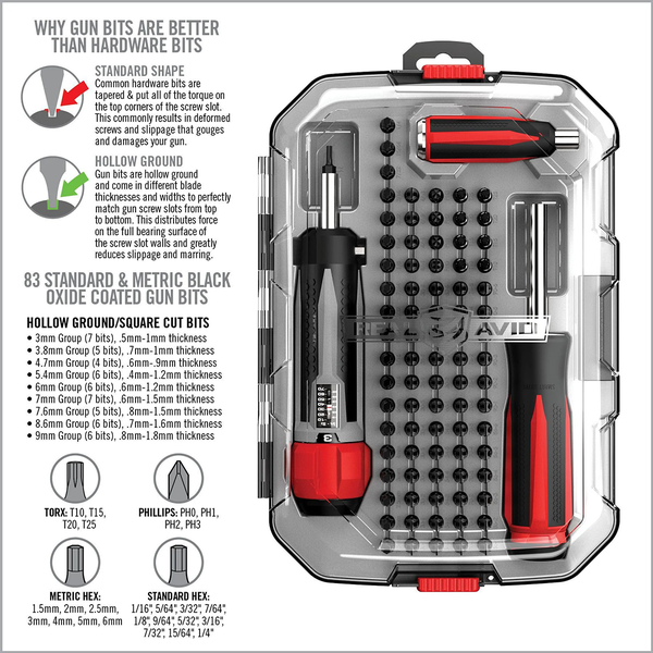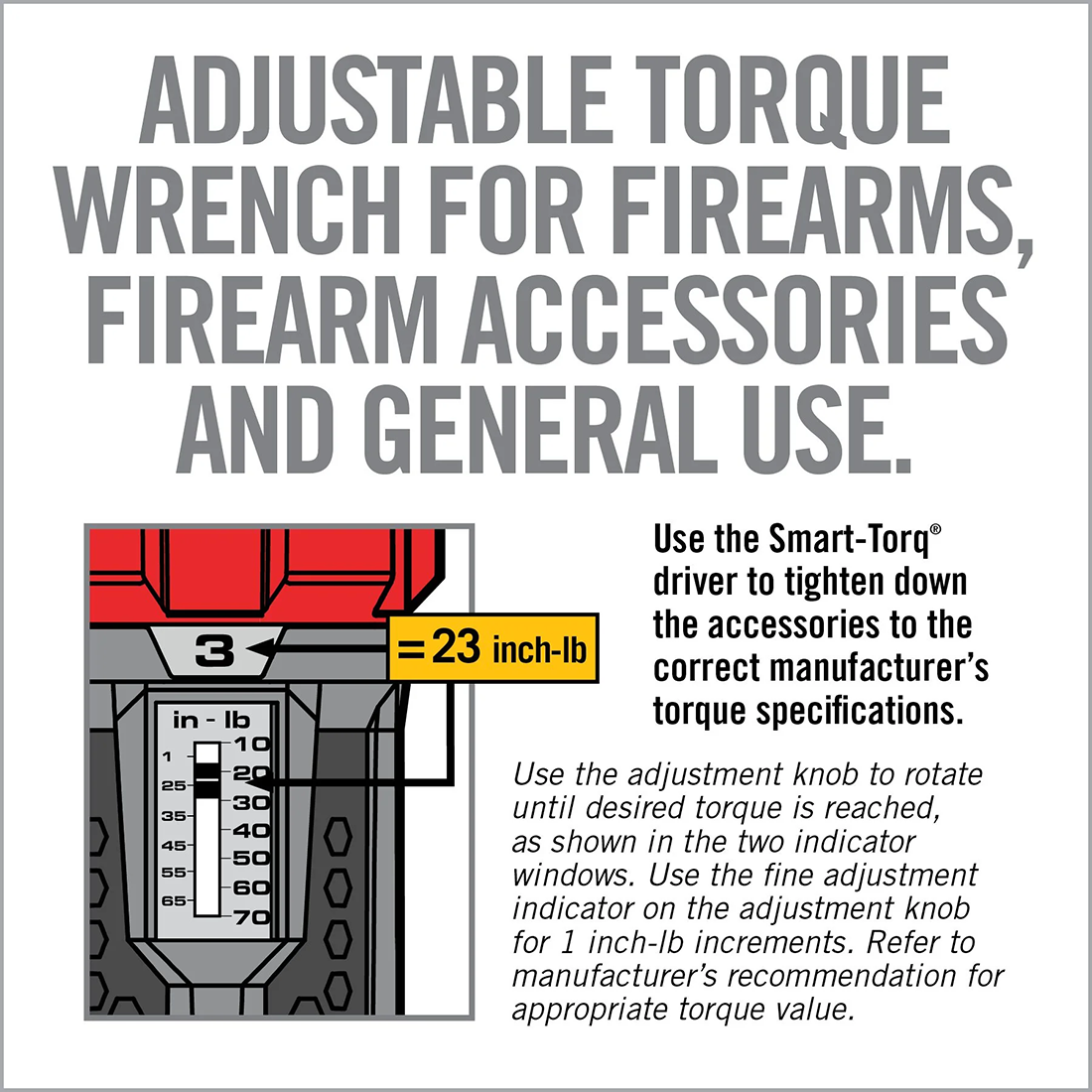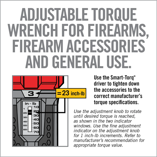 The Smart-Torq & Driver Master Set is a comprehensive toolkit designed for advanced gunsmithing tasks and beyond. Featuring an adjustable torque wrench with a range from 10 to 70 inch-lbs and precise 1 inch-lb increments, it ensures accurate tightening for optics, gun stocks and accessories. The set also includes a lighted bit driver with a 360° LED light for illuminating dark spaces, as well as a Force-Assist™ feature for easy screw tightening. Completing the set are 83 black oxide-coated gun bits, meticulously engineered for precise fitment and reduced slippage.