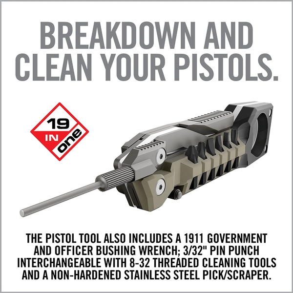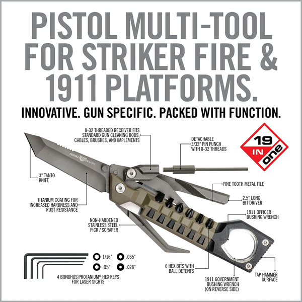 The Pistol Tool - the ultimate 19-in-1 multi-tool designed for handgun owners. With its compact size and ergonomic design, this versatile tool fits conveniently in a mag pouch. It features precision tools such as hex keys, bits, bushing wrenches, a pick/scraper, a Tanto knife and more. The Pistol Tool allows you to adjust sights, clean your firearm, install accessories, perform repairs and make modifications. Its durability, one-hand operation and high-quality construction ensure optimal performance. Upgrade your shooting experience with The Pistol Tool, the essential companion for all handgun enthusiasts.