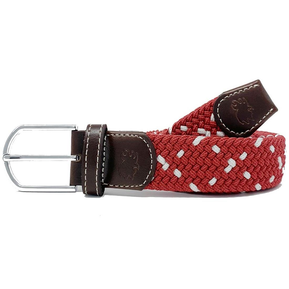 The Savannah two-toned woven stretch belt with crossing patterned braid. Crimson with a White cross-section with a rounded buckle and dark brown leather finish stamped with the Roostas logo. An adjustable clasp goes through the woven belt, allowing for adaptable sizing. Designed for optimal comfort on and off the course.