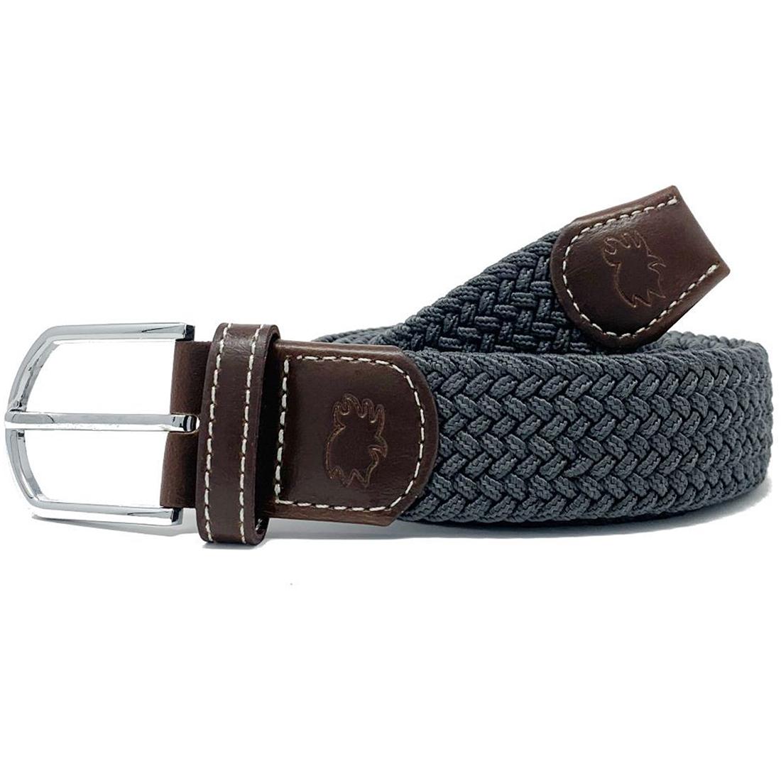 The Scottsdale braided stretch belt. Grey Belt with a silver rounded buckle and dark brown leather finish stamped with the Roostas logo. An adjustable clasp goes through the woven belt, allowing for adaptable sizing. Designed for comfort both on and off the course.