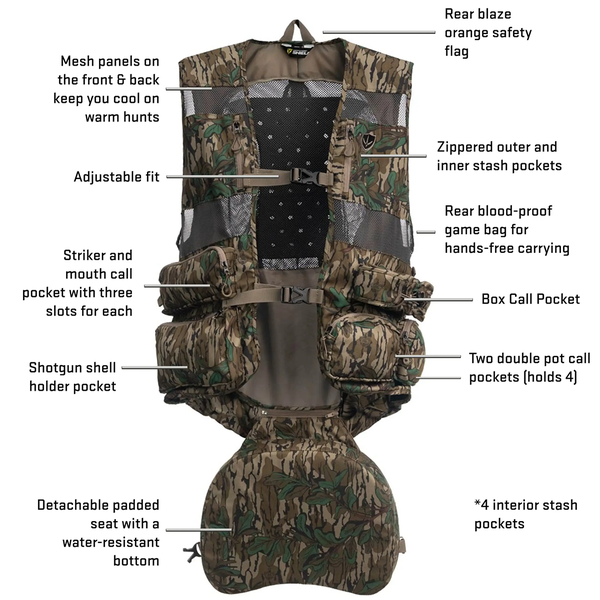 Whether sitting at a tree base or a run-and-gun chasing beards, you will have the comfort needed to last all day with the Blocker Finisher Pro II Turkey Vest. Long, hot days won’t dampen the hunt with the help of mesh paneling intended to keep you cool. Sit in comfort with the detachable and water-resistant seat cushion. Easily access your favorite calls in the many pocket options available. A rear game bag attachment provides hands-free carrying of your prized longbeard, while the full shoulder vest design keeps weight evenly distributed. Make all-day posting up comfortable and easy with the Blocker Finisher Pro II Turkey Vest.