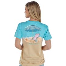 Blue and tan short sleeve shirt with the phrase 'The simple life' A beach scene with a beach chair and umbrella. Simply Southern logo below and on left chest. Turtle with an S on its shell on left chest. Unisex sizing.