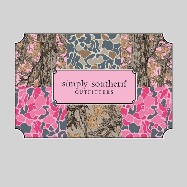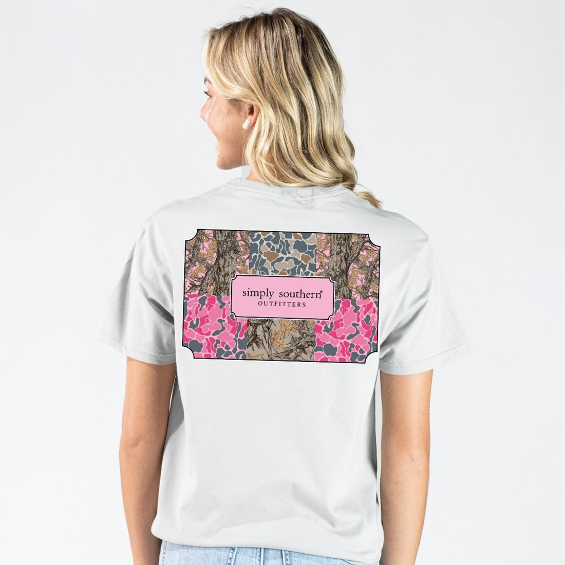 Made from 100% soft, breathable cotton, this short sleeve basic tee delivers all-day comfort in a clean, classic cut. This star grey tee features the Simply Southern logo with a border of paneled camo patterns.