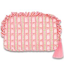 The Quilted Cosmo Bag features a zip closure, ruffle detailing, a fully lined interior, interior pocket, tassel zipper pull, and the Simply Southern logo label.