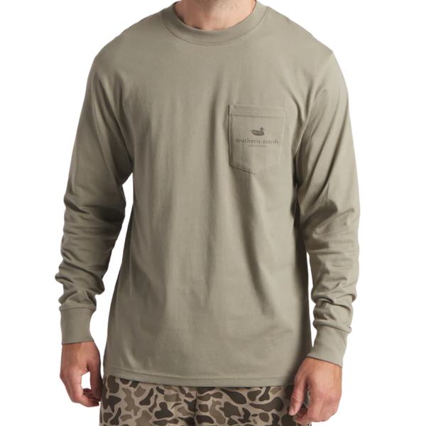 Crafted from 100% cotton and made for all day wear, the longe sleeve Inflight Camo Tee boasts a flying mallard design with camo Southern Marsh emblem on the back. The comfortable cotton tees have a handy front pocket and come with a printed neck tag for added comfort.