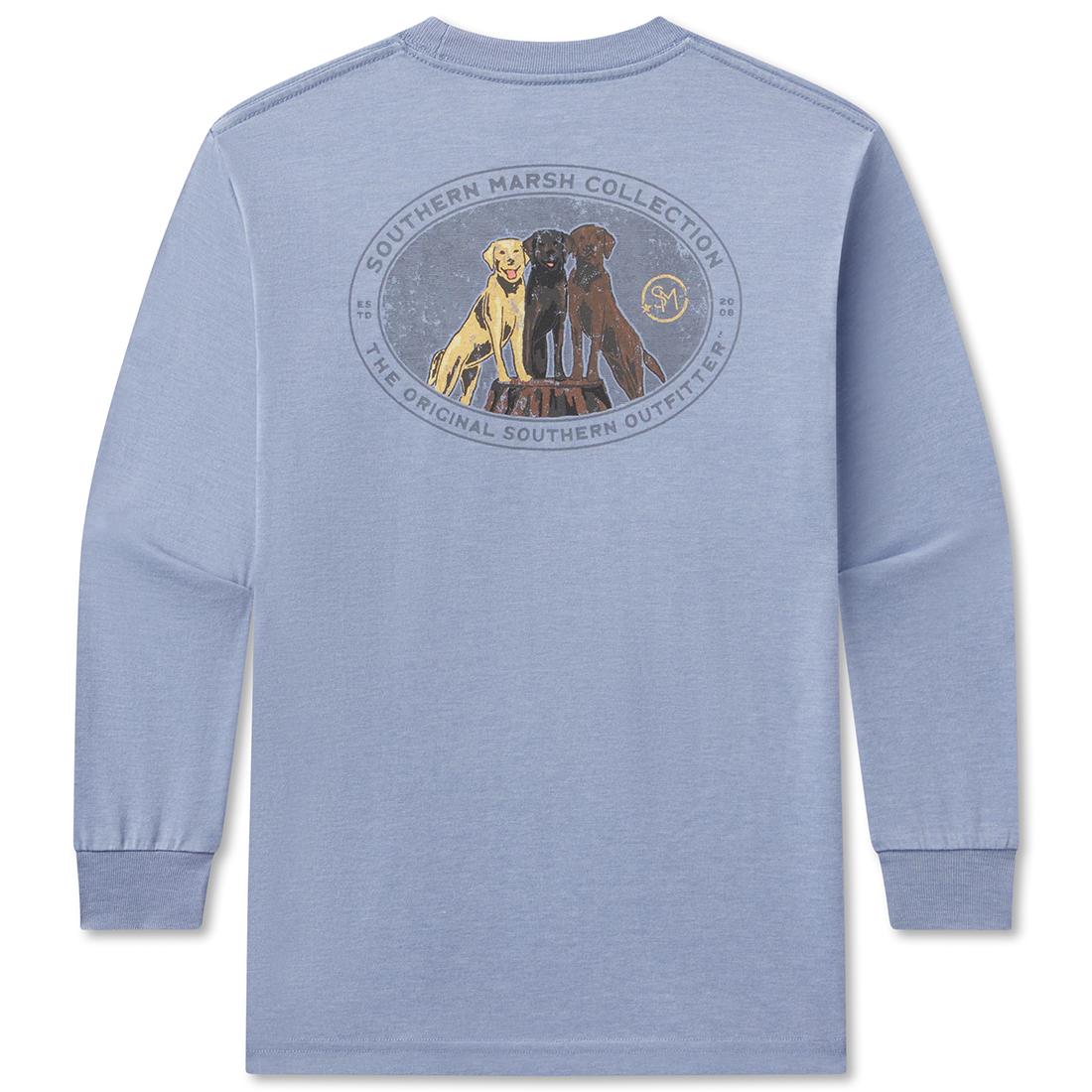 Breathable and lightweight, the Youth SEAWASH™? - Lab Trio long sleeve tee features a full color design of a yellow, chocolate and black lab posing together encircled by a Southern Marsh Collection medallion. Perfect for young dog lovers and aspiring duck hunters alike, this tee is perfect for layering.