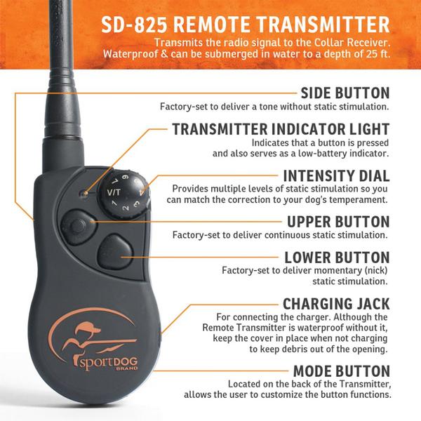 The rugged, versatile SportHunter® 825 maximizes all of the advanced, industry-leading technology that SportDOG® has ever built into its e-collars. The system provides long-range capability up to 1/2 mile, making it well-suited for long-distance control of retrievers and big-running pointing dogs. Switch instantly between stimulation, vibration, and tone to fit the correction or communication to your dog’s temperament and learning ability. The SD-825 can be easily expanded to control up to 3 dogs by adding SportDOG Add-A-Dog® collars.