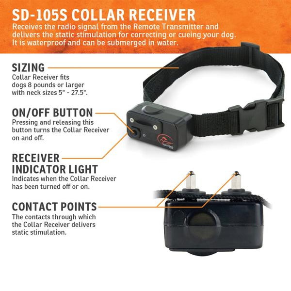 The YardTrainer 105S is designed specifically for tough or stubborn dogs, and is the perfect choice for introductory training and obedience. The SD-105S has a higher range of stimulation than the SD-105. The waterproof, compact Collar Receiver features a range of 100 yards, and the easy-to-use, water-resistant Remote Transmitter has 8 levels of stimulation and a tone-only button.