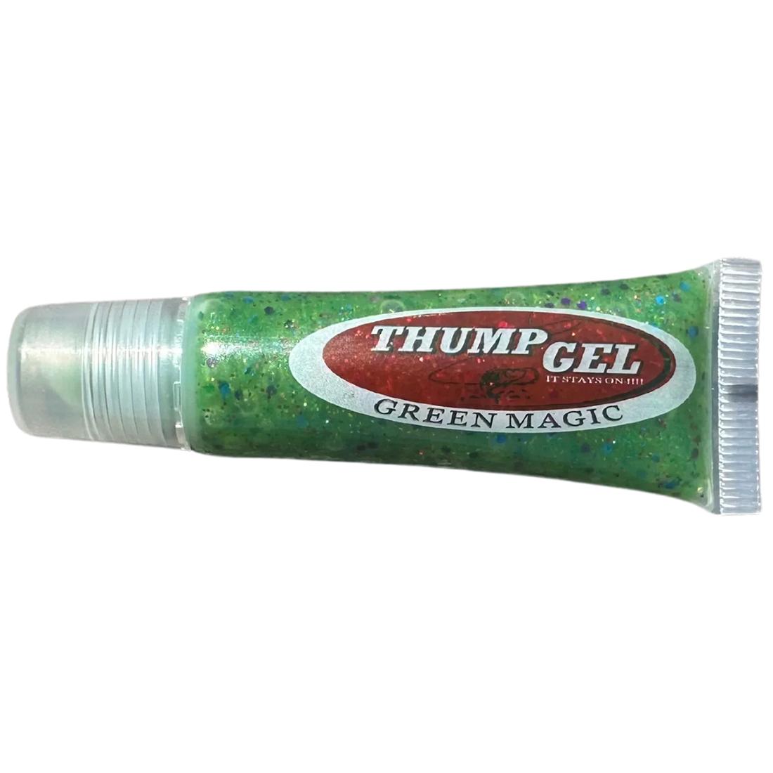 The original Thump Gel, Green Magic. Lime Green Sticky Gel formula fish attractant with Blue/Red/Purple/Green flake flash effect, scented with a taste that helps fish commit and crush it while Bass fishing or Crappie fishing. STAYS ON your bait longer, making THUMP GEL Green Magic it one of the best natural bait scent fish attractants on the water today!