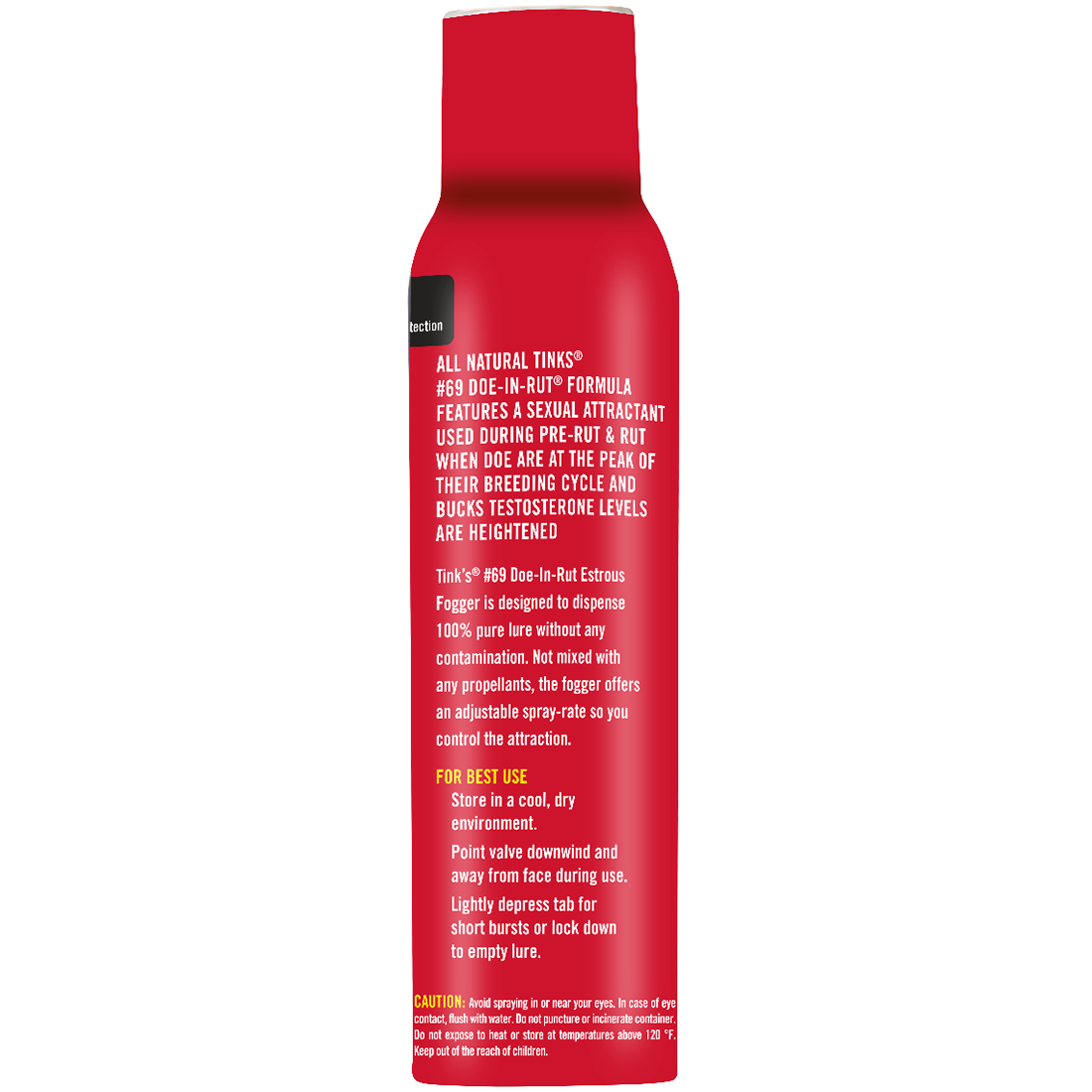 If it’s not broken, don’t fix it. One thing you can always hang your hat on is Tink’s® Signature #69 Doe-in-Rut®. Your granddaddy used this for years with success and there is nothing better than taking something Classic and adding a Twist. The All-New Tink’s® Fogger features 100% pure scent dispersal with the innovative Bag-On-Valve System. Tink’s® Fogger emits an undeniable cloud of sexual attractant that features the signature Tink’s® #69 Doe-In-Rut® formula that will not only travel to increase your reach, but will draw in that buck you’ve been waiting on.