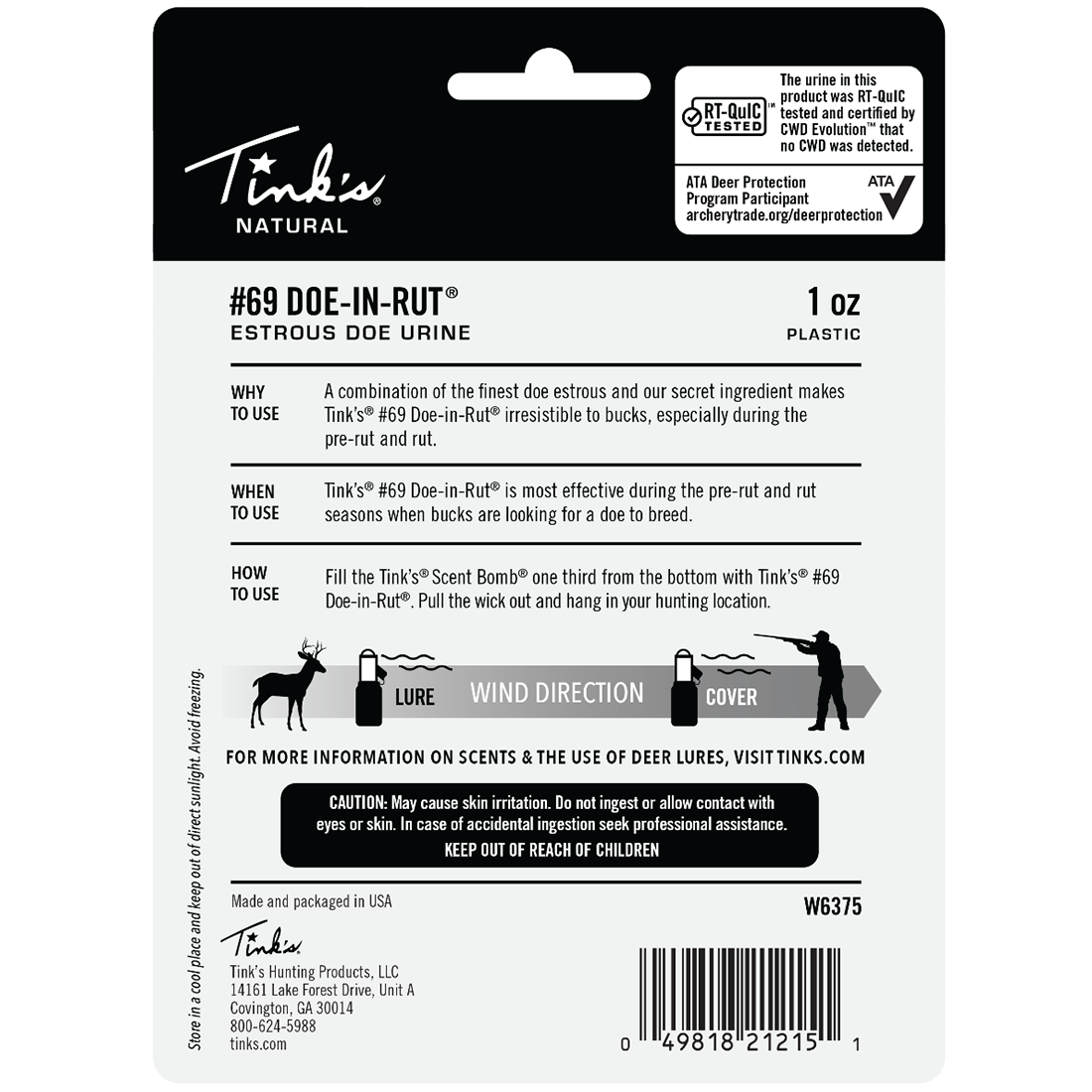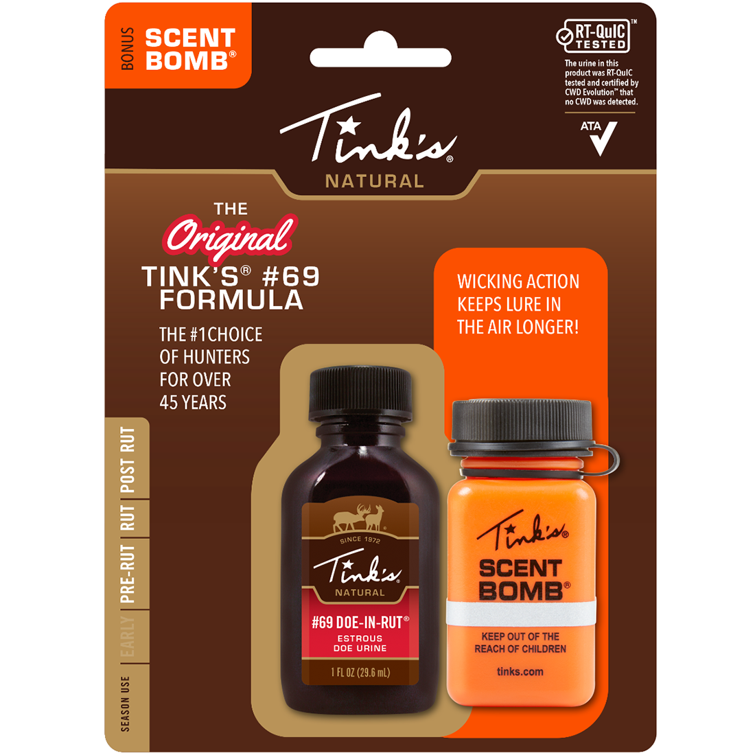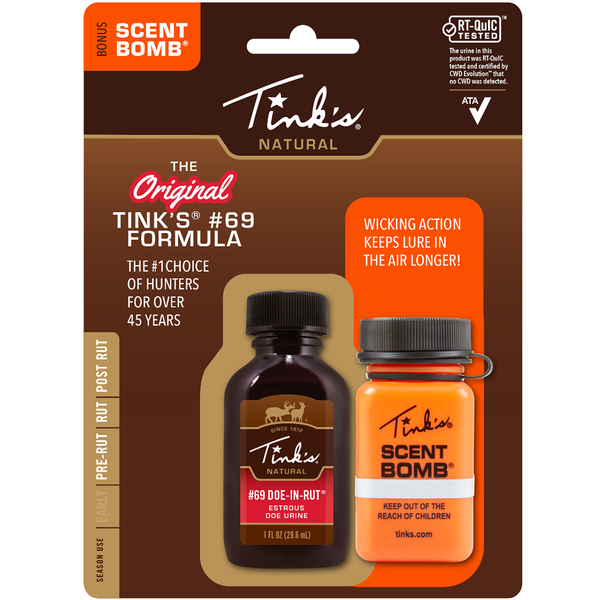 Tink’s® #69 Doe-In-Rut® Buck Lure is 100% natural doe estrous urine collected from live whitetail does during their estrous cycle. Tink’s® quality controlled formula keeps Tink’s® #69 Doe-In-Rut® Buck Lure at the peak level of performance. Tink’s® #69 Doe-In-Rut® Buck Lure, the standard on which all deer lures are measured, produces great results during the pre-rut and rut.