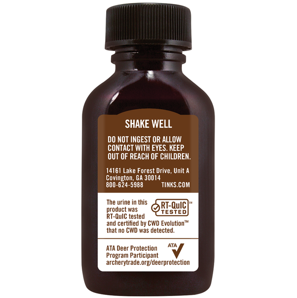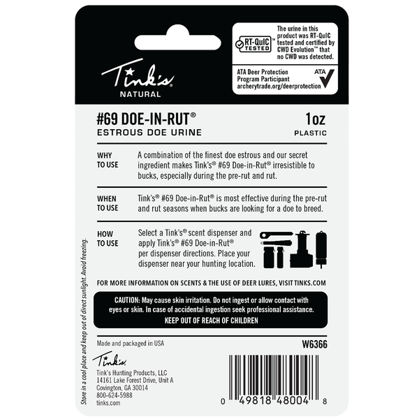 Tink’s® #69 Doe-In-Rut® Buck Lure is 100% natural doe estrous urine collected from live whitetail does during their estrous cycle. Tink’s® quality controlled formula keeps Tink’s® #69 Doe-In-Rut® Buck Lure at the peak level of performance. Tink’s® #69 Doe-In-Rut® Buck Lure, the standard on which all deer lures are measured, produces great results during the pre-rut and rut. Tink’s® #69 Doe-In-Rut® Buck Lure is America’s #1 Buck Lure!