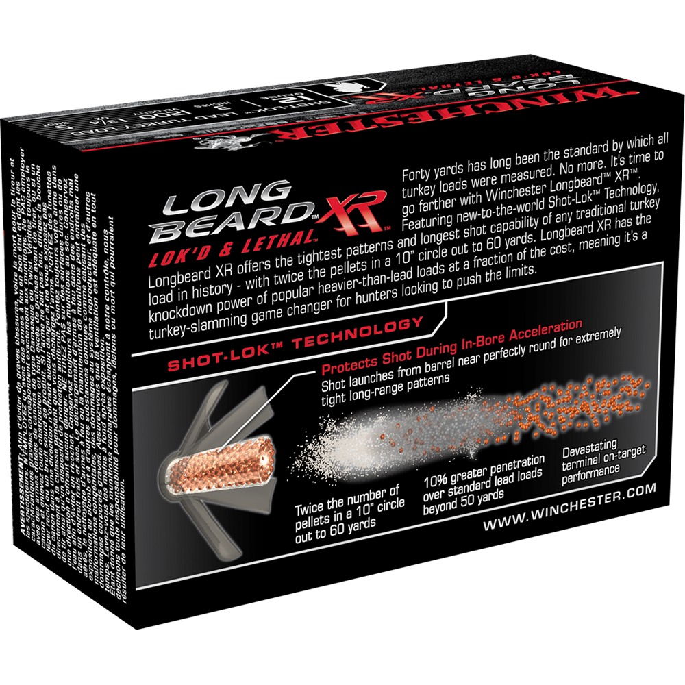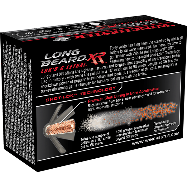 Forty yards has long been the standard by which all turkey loads were measured. No more. It's time to go farther with Winchester Longbeard XR. Featuring new-to-the-world Shot-Lok Technology. Longbeard XR offers the tightest patterns and longest shot capability of any traditional turkey load in history - with twice the pellets in a 10" circle out to 60 yards. Longbeard XR has the knockdown power of popular heavier-than-lead loads at a fraction of the cost, meaning it's a turkey-slamming game changer for hunters looking to push the limits.