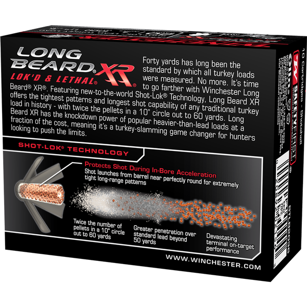 Forty yards has long been the standard by which all turkey loads were measured. No more. It's time to go farther with Winchester Longbeard XR. Featuring new-to-the-world Shot-Lok Technology. Longbeard XR offers the tightest patterns and longest shot capability of any traditional turkey load in history - with twice the pellets in a 10" circle out to 60 yards. Longbeard XR has the knockdown power of popular heavier-than-lead loads at a fraction of the cost, meaning it's a turkey-slamming game changer for hunters looking to push the limits.
