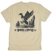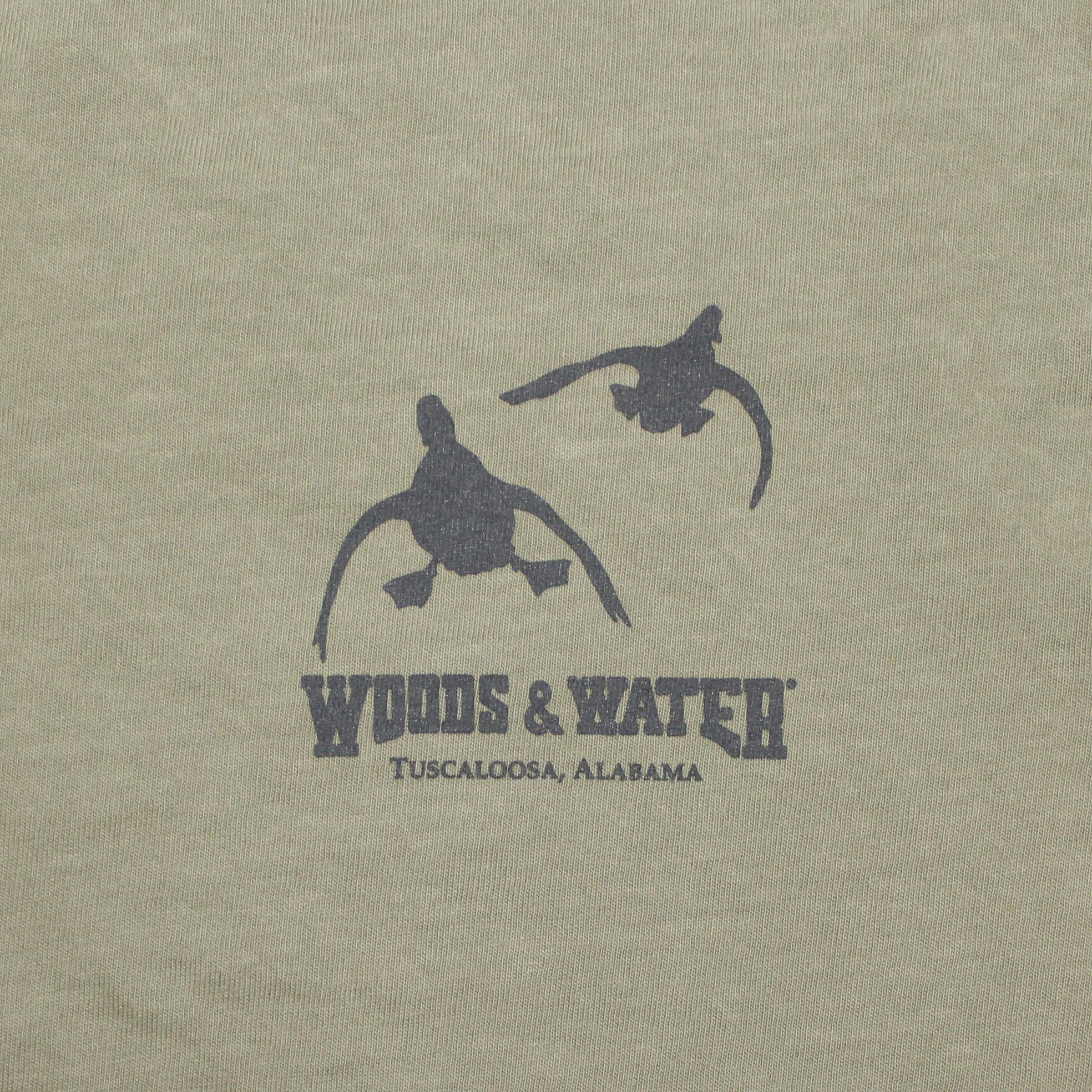 Comfort Colors Short Sleeve Tee with Woods & Water Wood Duck on back and Woods & Water Duck logo on left front.